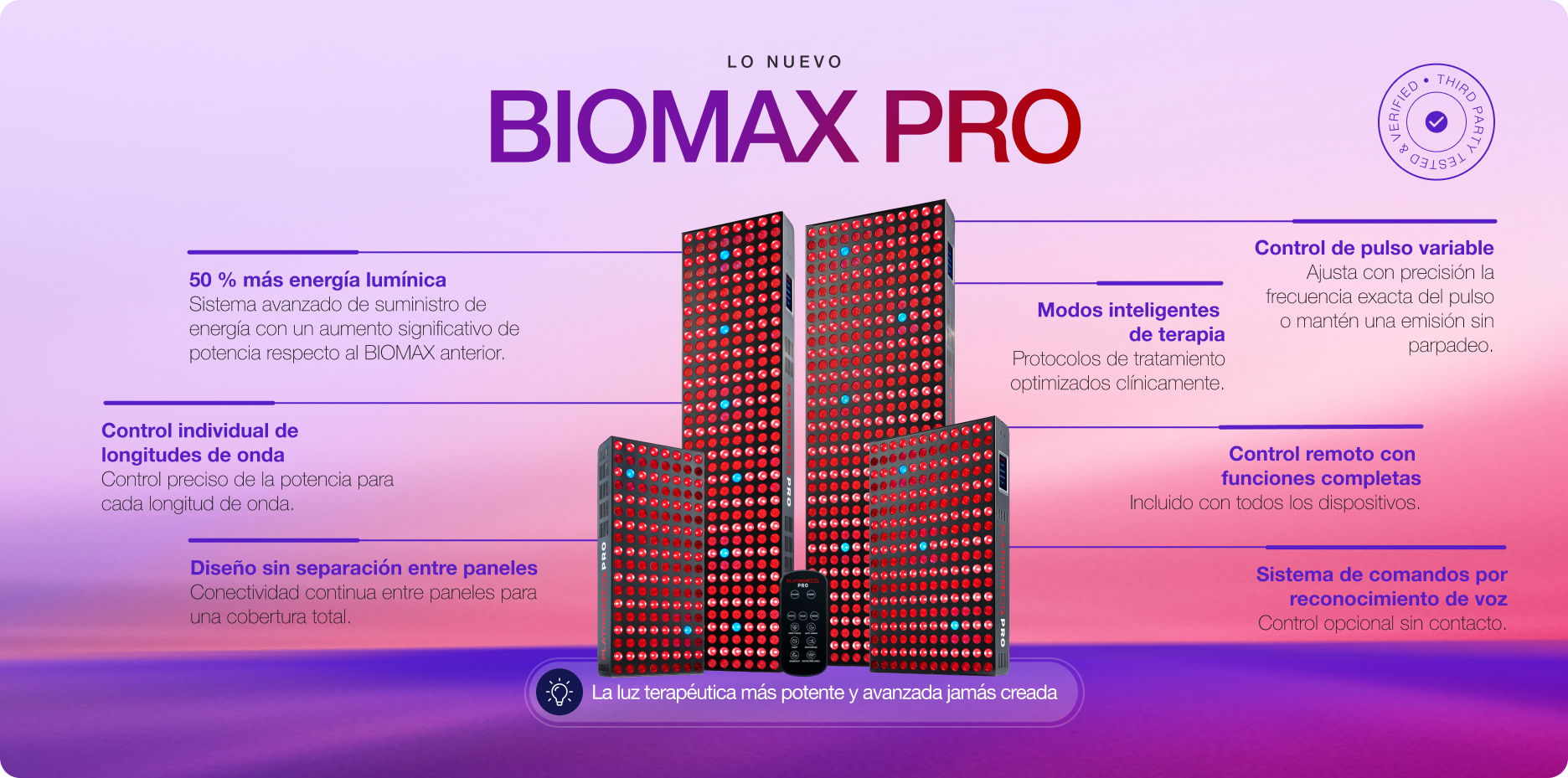 BIOMAX PRO cuenta con cinco mejoras principales: 50 % más de energía lumínica emitida (tiempos de tratamiento más cortos/mayor potencia), diseño "zero-gap" que elimina la separación entre múltiples paneles, control individual de longitud de onda, control ajustable de la salida de pulsos y la incorporación de preajustes del Modo Inteligente. La misma calidad líder en la industria y de grado médico, pero mucho más potente y precisa. BIOMAX PRO es la lámpara de terapia humana más potente y avanzada jamás creada, con un diseño único y revolucionario.